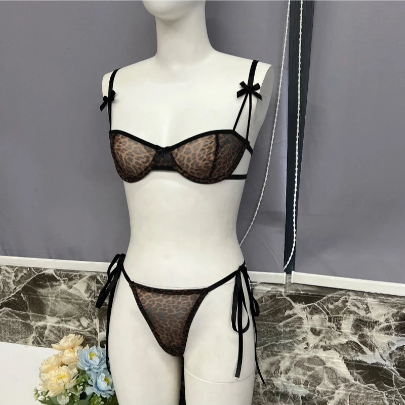 This captivating lingerie set features a leopard mesh print with silky black ribbon ties, blending exotic allure with refined design.