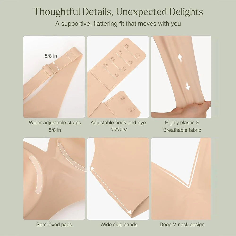 The elegant deep V-design enhances your natural curves while pairing beautifully with low-cut tops, making this bra suitable for professional settings, casual wear, yoga sessions, or evening events.